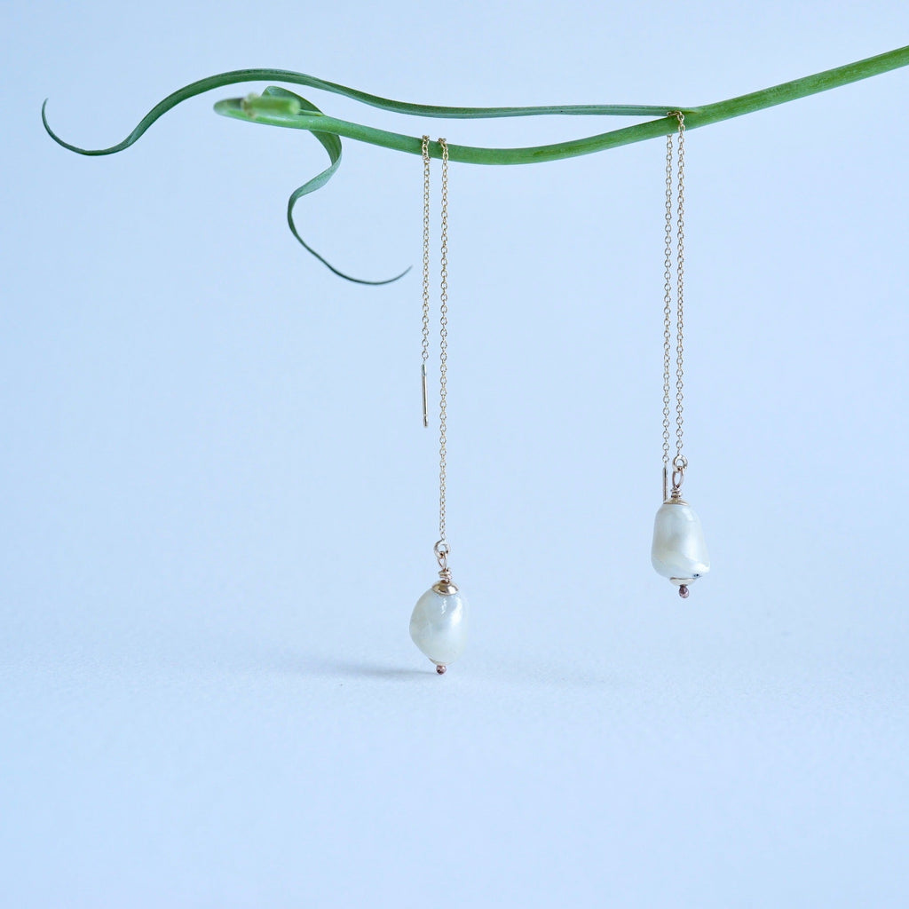 A beautiful pair of natural freshwater baroque pearls, repurposed from an antique necklace. hang from 14ct gold-filled chain threaders.