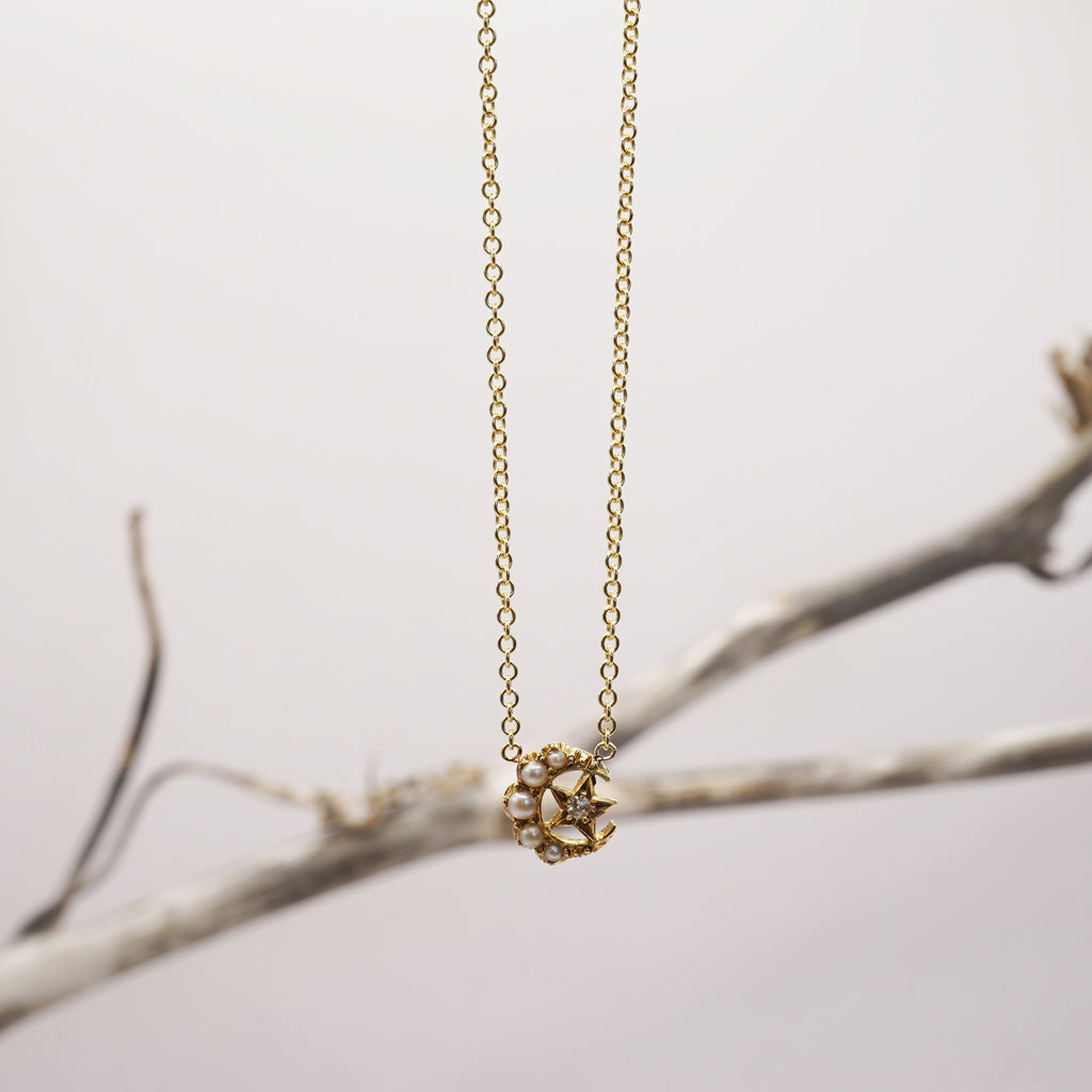 Gold Seed Pearl Moon and Diamond Star Necklace