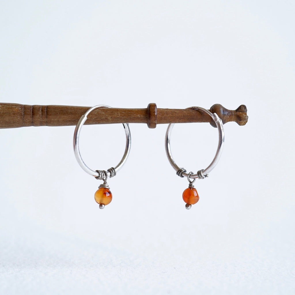 A beautiful limited edition pair of silver hoop earrings each hung with a vintage Indian agate bead repurposed from a piece of antique jewellery.
