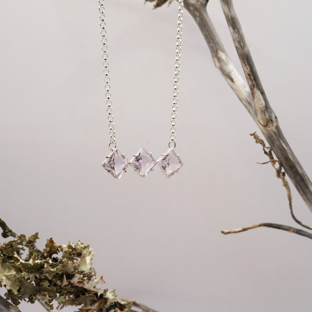An original vintage silver brooch set with 3 pale faceted Amethysts claw set in silver has been repurposed into this modern classic piece with the addition of a 16" silver belcher chain