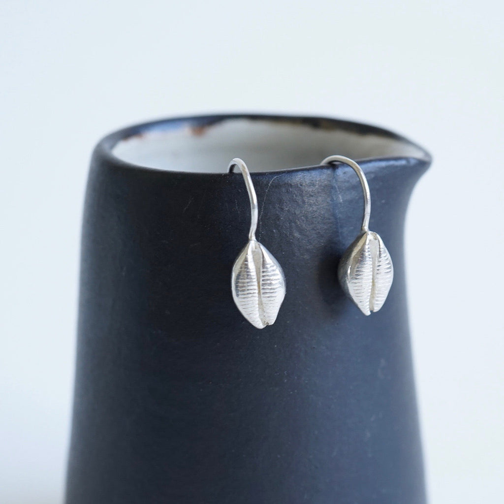A Limited edition pair of beautiful silver cowrie shell hook earrings .