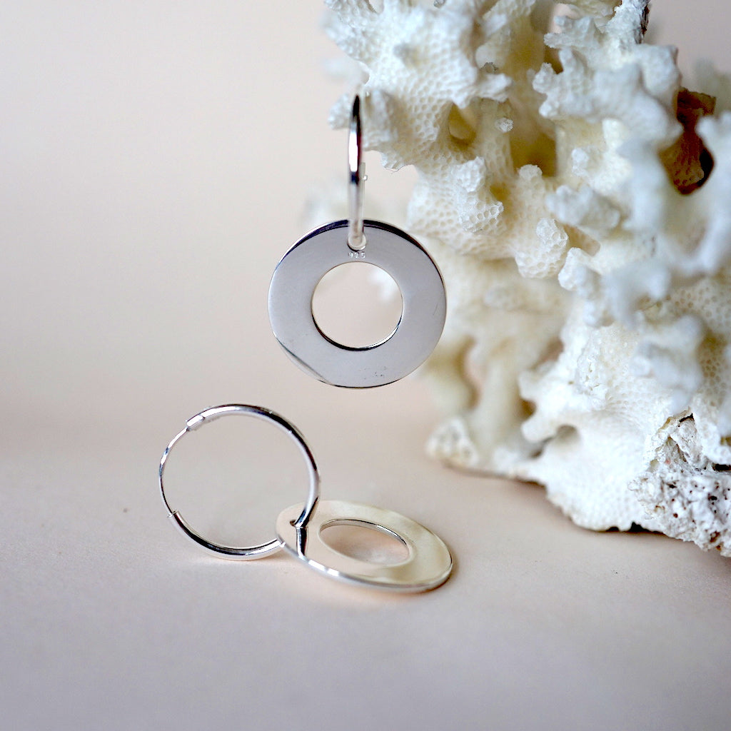 Silver discs hang from silver creole hoops creating a pair of stylish mid century modern earrings.
